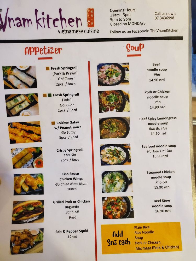 Welcome to The Vnam Kitchen, a charming eatery nestled in the heart of Rotorua, New Zealand, offering an authentic taste of Vietnamese cuisine. Their menu is a delightful exploration of flavors, featuring a variety of noodle soups that cater to diverse palates. The highlight is the aromatic Beef Noodle Soup, brimming with tender beef and fresh herbs, priced at just $22.50. For those seeking a spicy kick, the Beef Spicy Lemongrass Noodle Soup is a must-try, while seafood lovers will relish the Seafood Noodle Soup at $22.90.